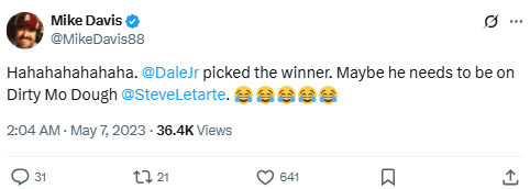 Hahahahahahaha. @DaleJr picked the winner. Maybe he needs to be on Dirty Mo Dough @SteveLetarte. 😂😂😂😂😂