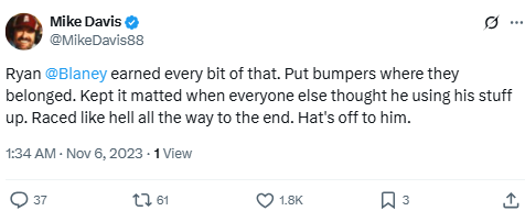 Ryan @Blaney earned every bit of that. Put bumpers where they belonged. Kept it matted when everyone else thought he using his stuff up. Raced like hell all the way to the end. Hat’s off to him.