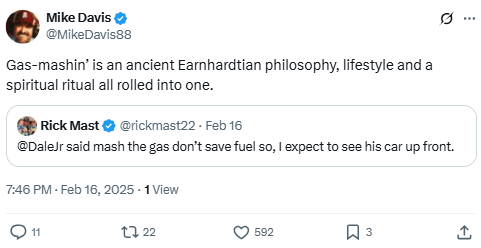 Davis responds to a Rick Mast tweet about Dale Jr.’s strategy by elevating “mashing the gas” to near-spiritual importance. He ties it back to Dale Earnhardt Sr.’s full-throttle racing legacy—celebrated especially during Daytona weekend—where speed takes precedence over caution.