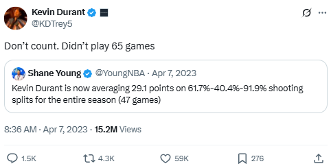 Durant dismisses an impressive stat about his 2022–23 season by pointing out he didn’t meet the 65-game threshold for awards. His sarcastic tone reflects his issues with the new NBA rule, which requires players to appear in at least 65 games to qualify for major honors.
