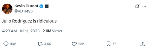 KD reacts to Julio Rodríguez’s performance in the 2023 Home Run Derby, where the Mariners slugger hit 41 homers in one round. It’s a short but impactful salute from one elite athlete to another.