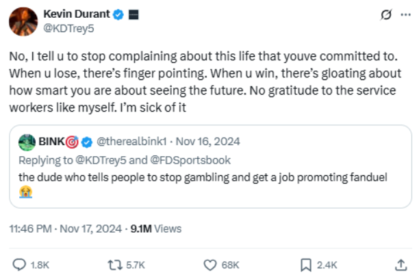 KD vents about the double standard he faces from sports bettors. Fans cheer when he helps them win but blame him when he doesn’t. The tweet touches on the increasing tension between athletes and the betting community in an era where player performance directly impacts financial outcomes.