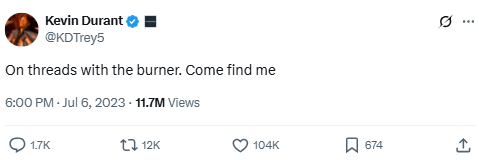 Durant jokes about using a burner account on Threads, Meta’s Twitter competitor. It’s a nod to his past controversy involving burner accounts and shows his ongoing comfort with online banter.