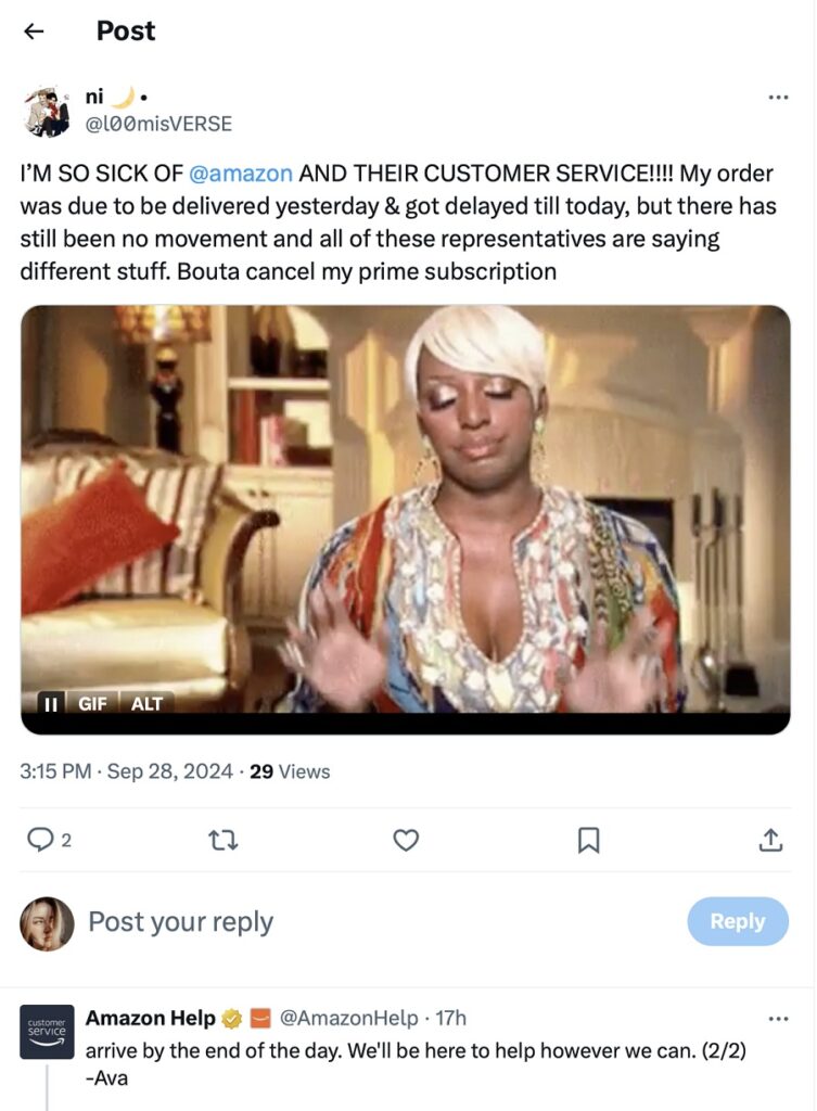 Here’s an example of a user complaining about Amazon’s customer service. They simply mention the brand’s name without tagging it directly using @.