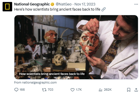 Sharing blog posts or in-depth articles on Twitter offers followers valuable content while driving traffic. For example, this National Geographic tweet effectively shares blog posts and articles on X, offering followers valuable content and driving traffic. By linking to an article about how scientists recreate ancient faces, National Geographic provides followers with interesting information. This approach educates the audience on scientific topics and encourages them to read the full article, increasing engagement and website visits.
