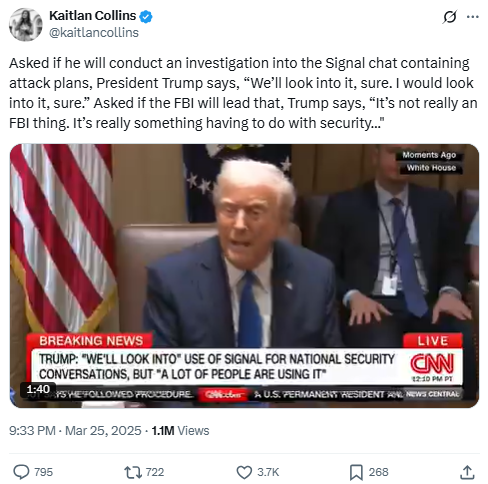 “Asked if he will conduct an investigation into the Signal chat containing attack plans, President Trump says, ‘We’ll look into it, sure. I would look into it, sure.’ Asked if the FBI will lead that, Trump says, ‘It’s not really an FBI thing. It’s really something having to do with security…'”