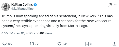 “Trump is now speaking ahead of his sentencing in New York. ‘This has been a very terrible experience and a setback for the New York court system,’ he says, appearing virtually from Mar-a-Lago.”