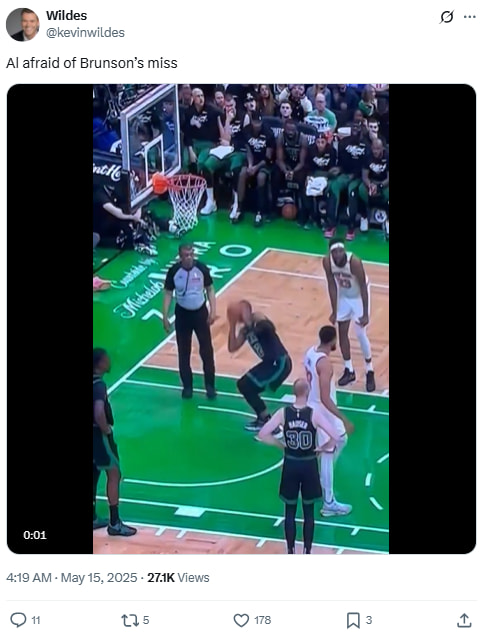 Wildes points out Al Horford’s visible flinch during a free throw by Jalen Brunson, highlighting a quirky moment in Game 6 between the Celtics and Knicks. The tweet nods to Horford’s history of reacting strongly during high-pressure plays and became a symbol of the Celtics’ rattled state as the Knicks won 119–81.