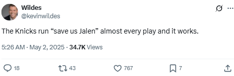 Wildes spotlights New York’s heavy reliance on Jalen Brunson, whose clutch plays propelled the Knicks past Detroit in the first round. Brunson averaged 31 and 8 in the series, including multiple 40-point performances. The tweet became a shorthand for the Knicks’ isolation-heavy offense centered around their star guard.
