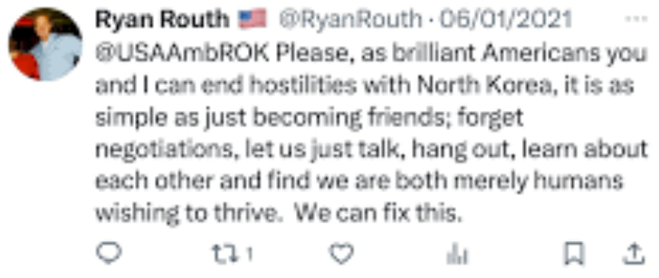 Routh theorized that media appearances by Kim Jong Un would be enough to end sanctions—then casually dropped his phone number.