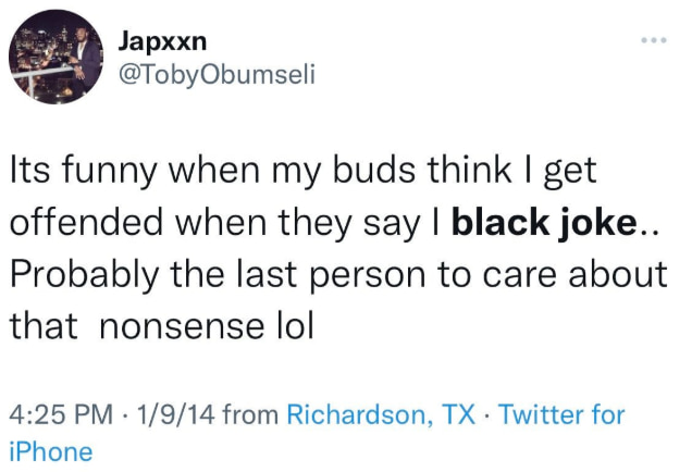 “Its funny when my buds think I get offended when they say I black joke.. Probably the last person to care about that nonsense lol”