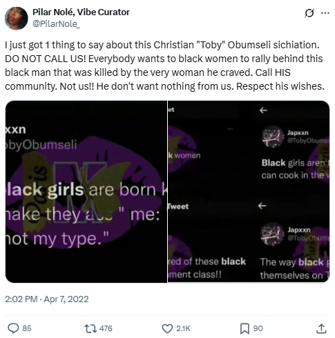“I just got 1 thing to say about this Christian ‘Toby’ Obumseli sichiation. DO NOT CALL US! Everybody wants black women to rally behind this black man that was killed by the very woman he craved. Call HIS community. Not us!! He don’t want nothing from us. Respect his wishes.”
