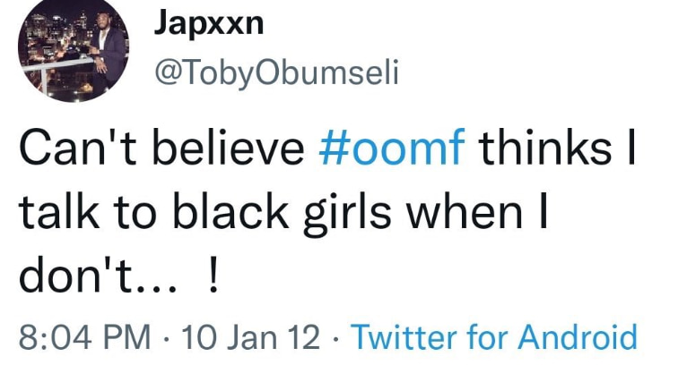 “Can’t believe #oomf thinks I talk to black girls when I don’t…!”