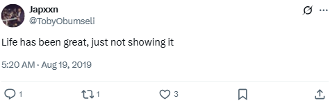 A self-empowerment tweet that gained darker relevance after his death. Reports show that Obumseli endured abuse alone, as documented in iCloud messages revealing stabbings and injuries prior to the fatal incident. His independence may have prevented him from seeking help.