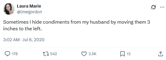 “Sometimes I hide condiments from my husband by moving them 3 inches to the left.”