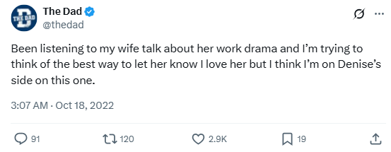 “Been listening to my wife talk about her work drama and I’m trying to think of the best way to let her know I love her but I think I’m on Denise’s side on this one.”