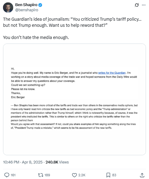 Shapiro shared a message from a journalist at The Guardian, Eric Berger, who was drafting a piece on conservative responses to Trump’s trade policies. Berger asked if Shapiro would phrase his criticism more directly toward Trump. Shapiro posted the request to highlight what he views as media bias and pressure to craft anti-Trump narratives.