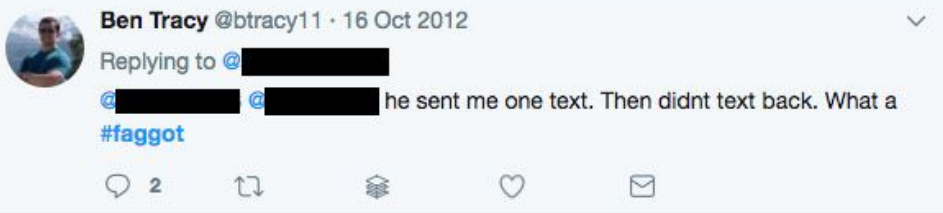 This tweet uses an explicit homophobic slur to insult someone, which is offensive and unacceptable. Language like this promotes hate and intolerance and has no place in any public or private setting. It reflects a serious lack of judgment and adds to the pattern of discriminatory behavior in Tracy’s posts.