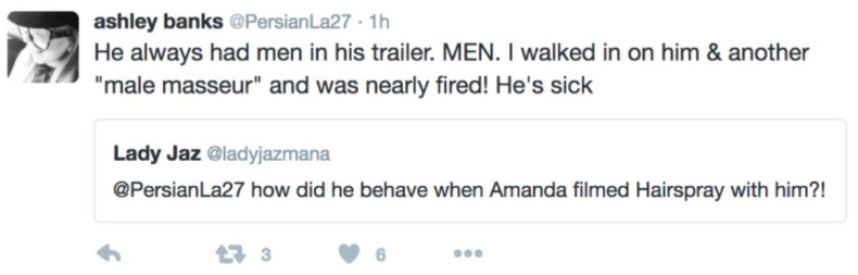 Responding to a follower asking about Hairspray, this tweet accuses Travolta of inappropriate behavior on set, hinting at backstage tensions.