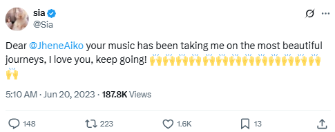 “Dear @JheneAiko your music has been taking me on the most beautiful journeys, I love you, keep going! 🙌🙌🙌🙌🙌🙌🙌🙌🙌🙌🙌🙌🙌🙌🙌🙌🙌🙌🙌🙌”