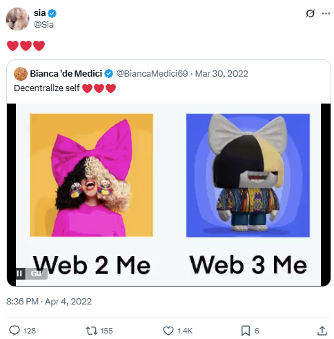 ❤️❤️❤️ (Quote tweet of Web2 vs. Web3 identity meme featuring Sia’s image and cartoon avatar)