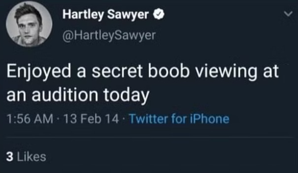 “Enjoyed a secret boob viewing at an audition today”