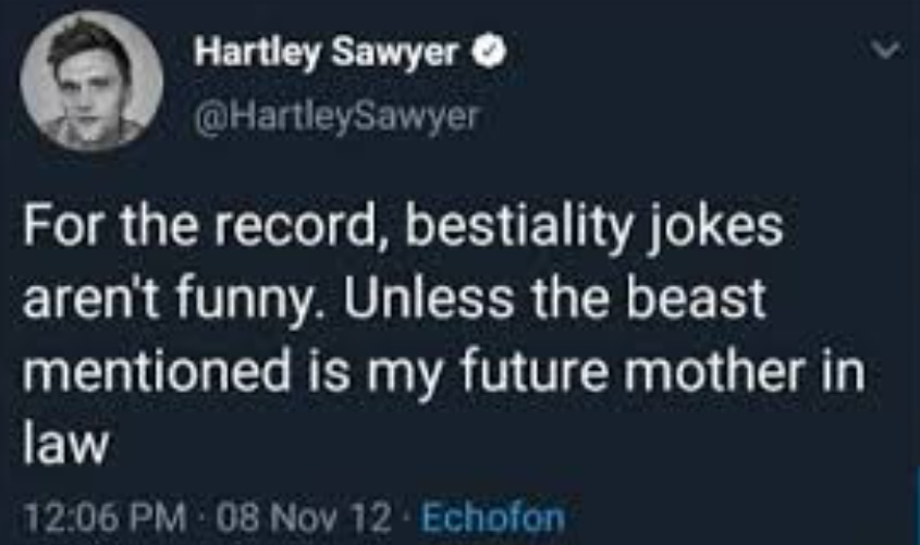 “For the record, bestiality jokes aren’t funny. Unless the beast mentioned is my future mother in law”