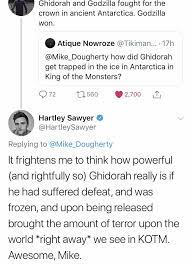 A surprisingly earnest and nerdy breakdown of Godzilla: King of the Monsters. One of the few tweets where Sawyer channels serious fan energy.