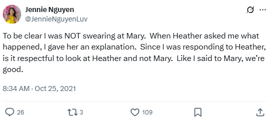 “To be clear I was NOT swearing at Mary. When Heather asked me what happened, I gave her an explanation. Since I was responding to Heather, is it respectful to look at Heather and not Mary. Like I said to Mary, we’re good.”