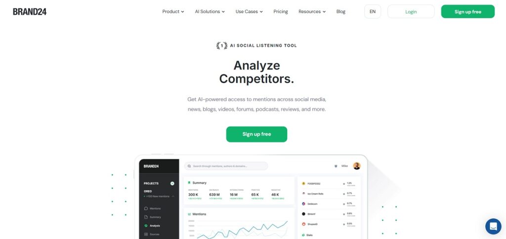 Mention is a well-established social listening tool that offers more than just monitoring. It provides detailed analytics for different accounts and allows users to track competitor activities. Upon signing up, Mention prompts you to set alerts for keywords, hashtags, and competitors you want to monitor. Additionally, it suggests top brands in your industry for competitor analysis, helping you stay ahead in your niche.