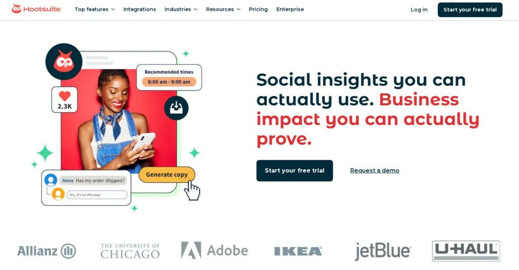 Hootsuite offers a comprehensive social media management platform where you can schedule posts, see how people interact with your content, and check how well your posts are doing—all in one place.
