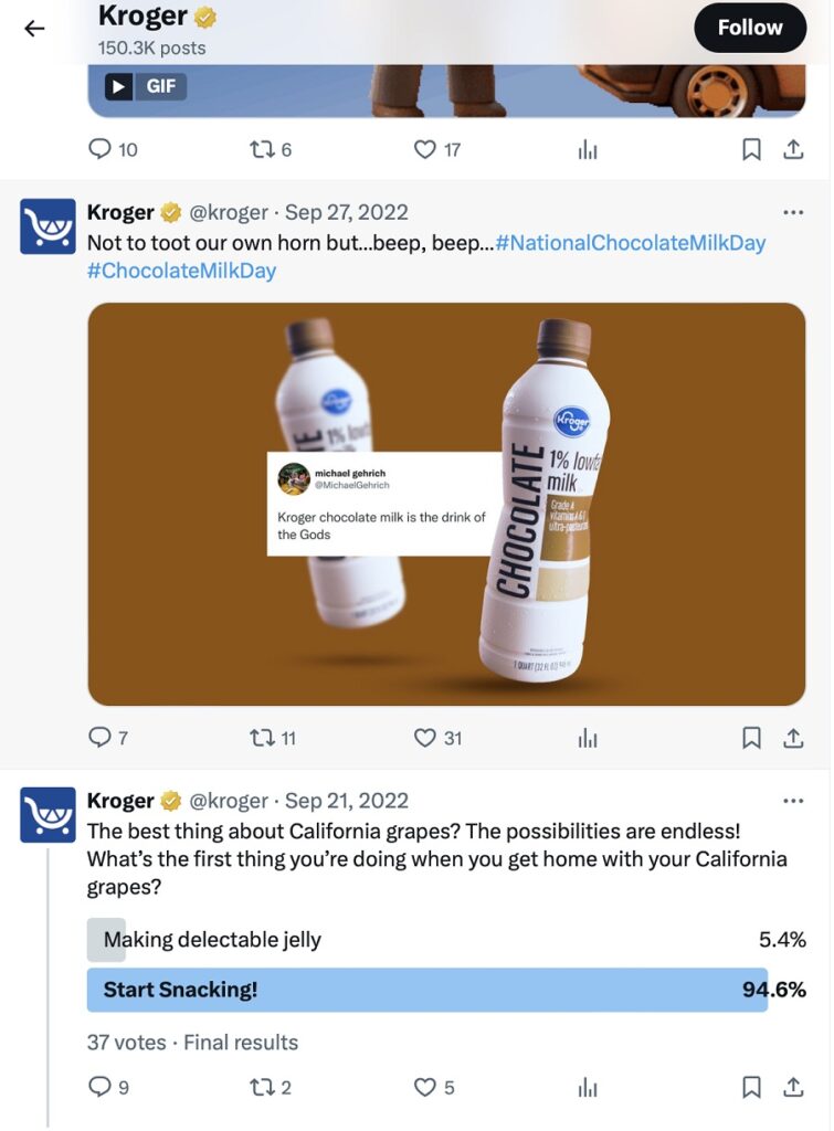 A perfect example? Check out Kroger’s account. Solid number of followers.