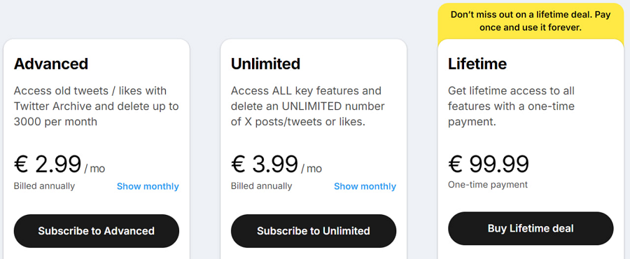 Manual deletion is not an option, as it’s too time-consuming. So, a tool like Tweet Deleter may come in handy. It’s an official X partner, so you don’t have to worry about its reliability.
