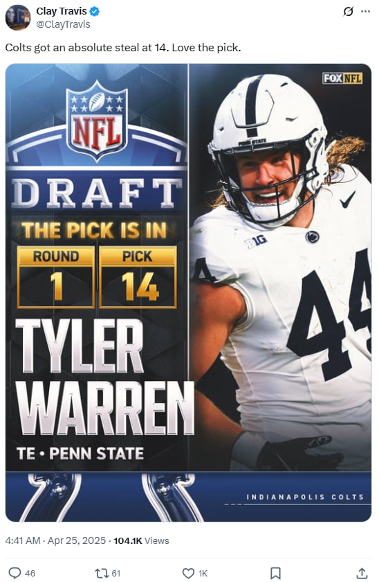 Clay praised the Colts’ selection of Penn State TE Tyler Warren at No. 14 in the 2025 NFL Draft. Projected as a top-10 talent, Warren’s drop was considered surprising. His standout stats and award-winning performance made him a highly valuable addition to Indianapolis.