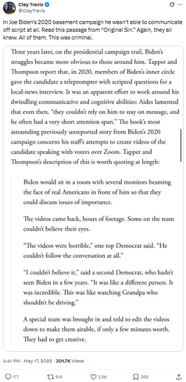 In Joe Biden’s 2020 basement campaign he wasn’t able to communicate off script at all. Read this passage from “Original Sin.” Again, they all knew. All of them. This was criminal.