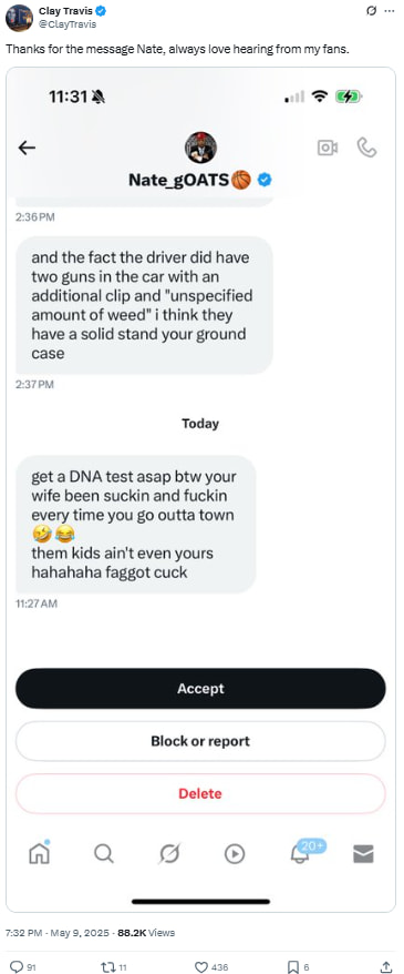 Clay shared a hostile private message from someone claiming to be Nate Oats, filled with personal attacks and homophobic slurs. The post highlighted the ongoing tension between public figures and sports media personalities.