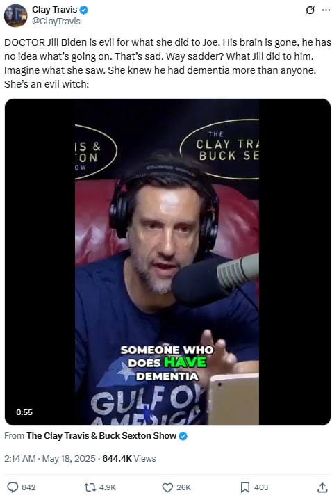 In a harsh post, Travis accused Jill Biden of knowingly keeping Joe Biden in the public eye despite his decline, calling it abusive and unethical.