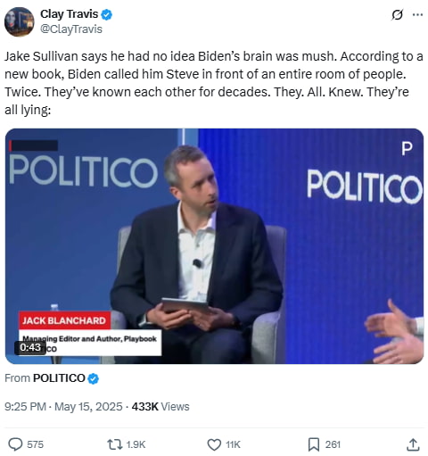 Jake Sullivan says he had no idea Biden’s brain was mush. According to a new book, Biden called him Steve in front of an entire room of people. Twice. They’ve known each other for decades. They. All. Knew. They’re all lying:
