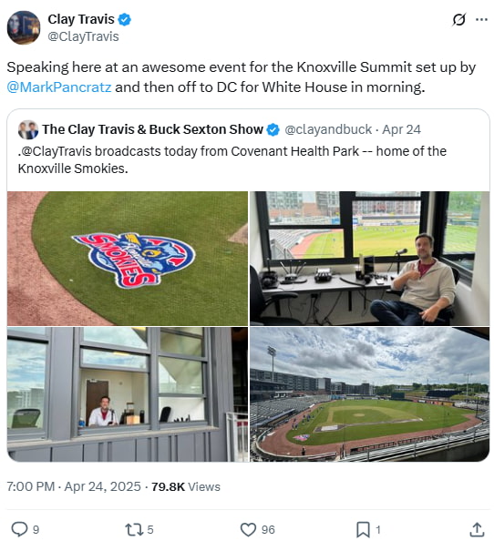 Clay tweeted from the Knoxville Summit held at Covenant Health Park, celebrating its return after 25 years. The event included major speakers and marked the park’s evolving community role. He also noted a following trip to Washington, D.C., presumably for media or political engagement.