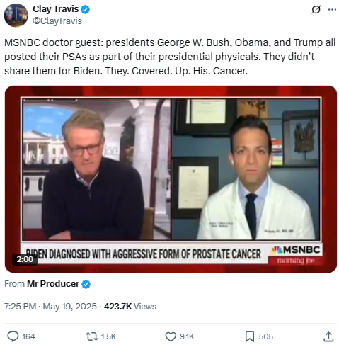 MSNBC doctor guest: presidents George W. Bush, Obama, and Trump all posted their PSAs as part of their presidential physicals. They didn’t share them for Biden. They. Covered. Up. His. Cancer.