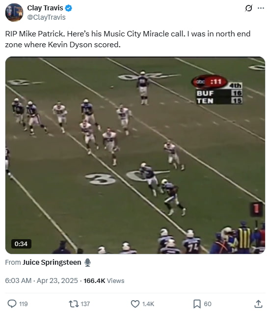 RIP Mike Patrick. Here’s his Music City Miracle call. I was in north end zone where Kevin Dyson scored.