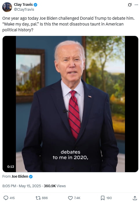 Travis reflected on Biden’s past challenge to Trump, calling it a major misstep in hindsight due to Biden’s later debate performance. The post questioned Biden’s decision-making and framed the challenge as politically damaging.