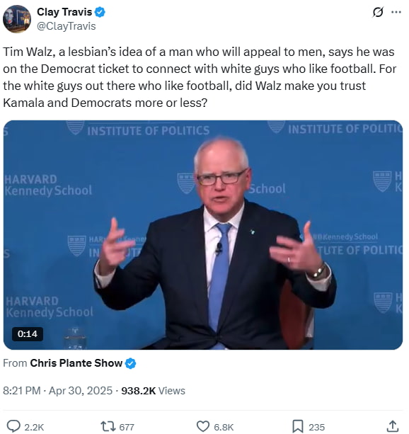 Clay reacted to Walz’s comments on being selected to appeal to white male football fans, criticizing what he saw as identity-based political pandering.