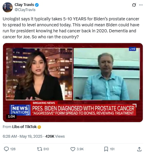 Travis cited a urologist who claimed Biden’s aggressive cancer could date back years, suggesting it may have been present during his 2020 campaign, fueling cover-up allegations.