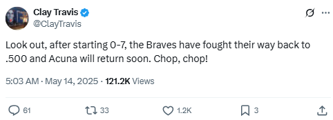 In a rare sports-only tweet, Travis celebrated the Atlanta Braves’ return to form after a rough start. He mentioned Ronald Acuña Jr.’s return and the team’s push to get back to .500, signaling a potential mid-season comeback.