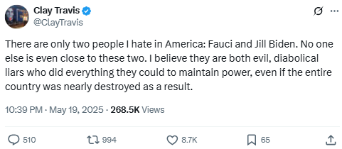Travis stirred controversy with this post naming Dr. Anthony Fauci and First Lady Jill Biden as his top targets of disdain. He criticized their roles in pandemic-era policies and influence, echoing sentiments common in Republican circles.