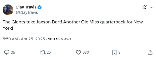 Reacting to the Giants’ first-round draft pick of Jaxson Dart at No. 25, Clay pointed to the franchise’s recurring pattern with Ole Miss QBs. Dart’s selection came amid ongoing debate over Shedeur Sanders being passed up, sparking commentary on draft biases and team strategies.