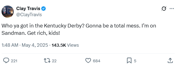 Clay made a bold pick for the Derby, favoring “Sandman,” who ultimately finished 7th. He acknowledged the poor track conditions and expected chaos in the race.