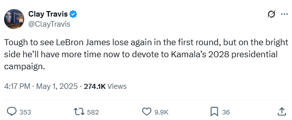 Tough to see LeBron James lose again in the first round, but on the bright side he’ll have more time now to devote to Kamala’s 2028 presidential campaign.