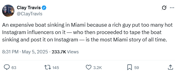 An expensive boat sinking in Miami because a rich guy put too many hot Instagram influencers on it — who then proceeded to tape the boat sinking and post it on Instagram — is the most Miami story of all time.